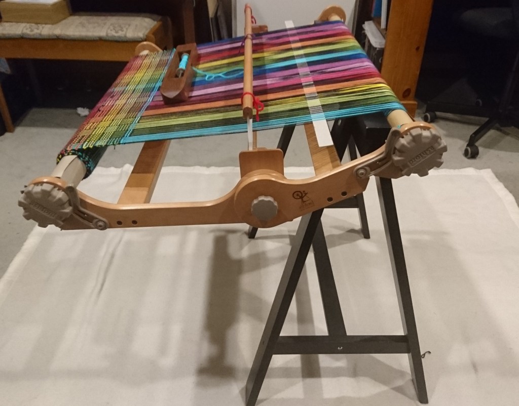 I’d like to add though, as another option, I have seen this handy little loom used by resting it on the weaver’s legs in a reclining chair/sofa (example in this YouTube video). As a more light-weight loom this might be a helpful position for anyone who cannot sit upright in a hard chair for long.