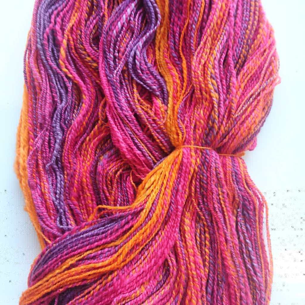 Warp: Handspun polwarth wool, dyed in “Orchid” colourway and plied as a fractal.