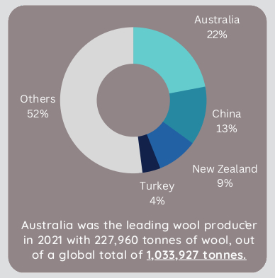 For example, in 2021 Australia was the leading global producer of wool, producing 22% (or 227,960 tonnes) of the global total of 1,033,927 tonnes. That might seem like a large number, however it’s less than 1% of the total amount of 113 million tonnes of fibre produced globally in 20211.
